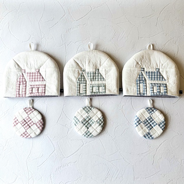 お茶やコーヒーを淹れたけど、時間が経って冷めてしまったことはありませんか? 淹れた後にちょっと手が離れたり、家族の食事の時間が合わないのはよくあること。 そんなときに便利なティーコゼを作りました。 急須やティーポットにカポっと被せるだけで気軽に保温できるので、温め直す回数もグンと減らせます。 パッチワークのおうちは見た目にもほっこり。 ほどよいアクセントになりつつ、少しグレーがかったスモーキーカラーでスッとお部屋に馴染みます。 カラーはくすみグリーン、ピンク、ライトブルーの3種類。 ギンガムチェックがとっても可愛いので、敢えてホワイトだけを合わせてスッキリと仕上げました。 手仕事の雰囲気を楽しんでいただけるよう、おうちの周りを手縫いで細かくキルティングしています。 裏布はチェックに合うグレーのキルティング生地を選びました。 汚れが目立たないのもポイントです。 カーブにはダーツを4か所入れて、型崩れしにくくしました。 お揃いのポットマットと使うのも、統一感が出ておすすめです。 マットを使わないときはティーコゼ本体にぶら下げて収納できます。 セットで母の日や新築祝いなどのプレゼントにもぴったりです。 ハンドメイドのぬくもりも一緒に、温かい飲み物をゆったりと味わってもらえたらうれしいです。 〇保温目安について 室温や残量等の条件で変化しますが、1時間ほどは温かさをキープできます。 ※お湯を沸かしてからの温度を測ってみました ・ティーコゼあり 0分:84℃▷30分後:66℃▷60分後:57℃▷90分後:49℃(少し冷めたかな?と感じる程度) ・ティーコゼなし 0℃:85℃▷30分後:63℃▷60分後:48℃▷90分後:40℃(ぬるいと感じました) 〇サイズ ・ティーコゼ たて:22㎝ よこ:26.5㎝ 厚さ:3.7㎝ フック:4㎝ (平置き時、手作りのため多少の個体差があります) ※2~4杯用のサイズ感です ・ポットマット 直径:15㎝ フック:4㎝ 〇素材 ・表布:コットン ・キルト芯:ポリエステル ・裏布:キルティング生地 〇お手入れ方法 型崩れ防止のため、中性洗剤でやさしく手洗いまたはネットに入れて洗濯機で洗ってください。 アイロンは中温でかけてください。 〇ラッピングについて 有料(+300円)でボックスに入れてラッピングいたします。 ご希望のリボンをオプションよりお選びください。 〇ご購入時の注意点 ・布製ですので、火気近くではご注意下さい。 ・丁寧な縫製を心がけていますが 縫い目のゆがみやズレなどはハンドメイドの味わいとお考えくださると幸いです。 ・光の加減等で画像上の色と実際の色が異なる場合があります。 ご了承いただいた上でご購入をお願いします。 ・総柄の生地を使用しておりますので、1枚1枚柄の出方が異なります。