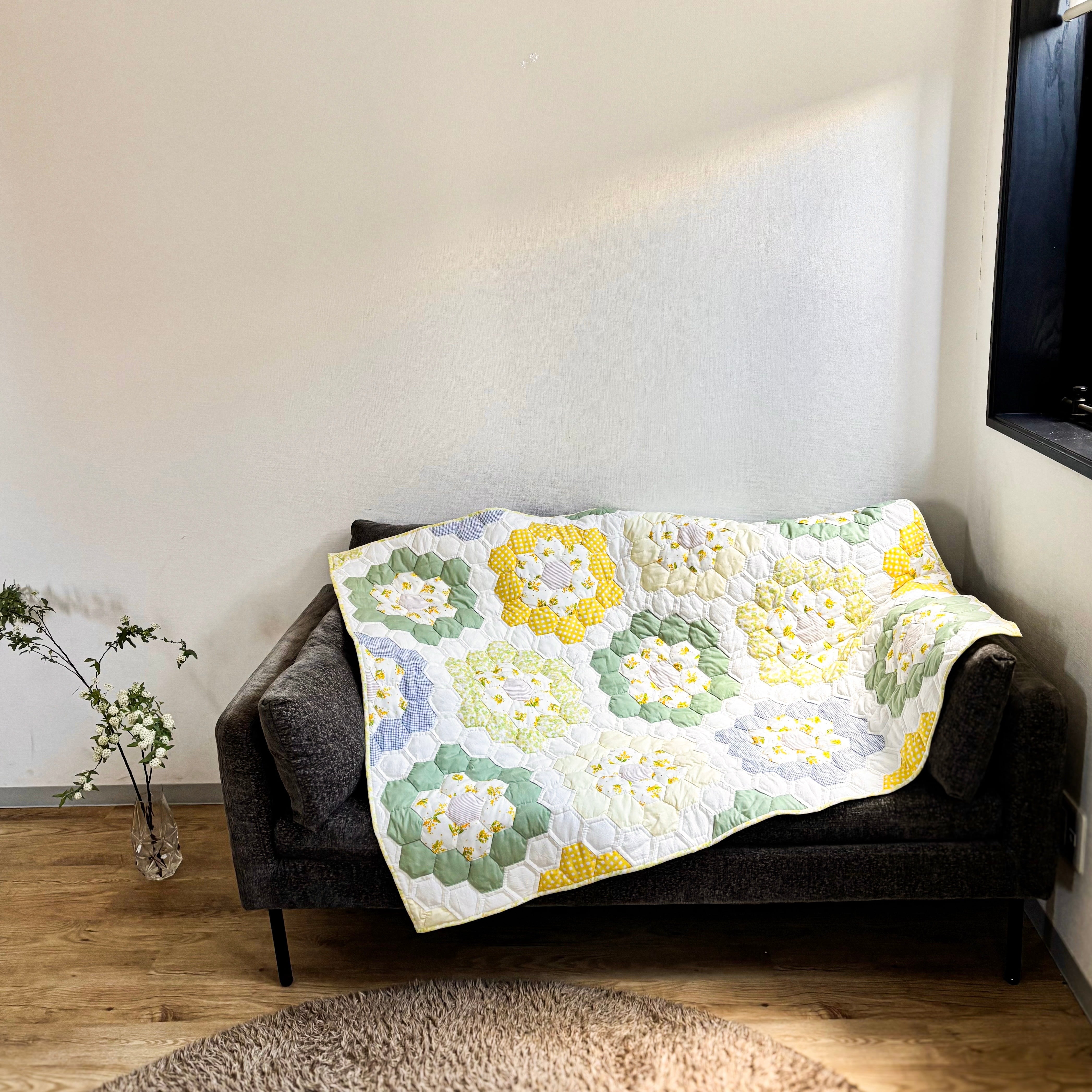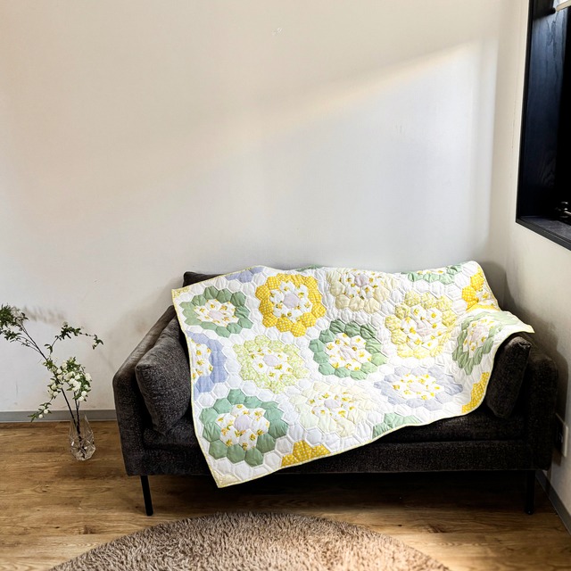 目にするたび、心が和むパッチワークキルト。 外から帰った夕方や家事の合間の束の間のひとときにもほっとくつろぎたい…そんな想いから、このキルトシリーズが生まれました。 同じものを作ることのない、一点ものです。 コロコロ可愛い春のミモザ。 イエローやグリーンのお花が咲いたキルトは、1枚広げるだけで暖かな陽気を連れてきてくれそうです。 選び抜いた生地を六角形にひとつひとつ切り取り、丁寧に縫い合わせました。 一番のこだわりは、手縫いで入れたキルティング。 足跡のように、ひと針ひと針進めた不揃いな縫い目がほっこりやさしく、手縫いならではのやわらかな質感をお楽しみいただけます。 ソファーでくつろぐときの冷え対策やお昼寝のときにすっぽり身体を包めるサイズ感です。 春が訪れるまでの肌寒い日も温かいように、厚手のキルト芯を使いました。 裏布は様々なシーンで使えるコットン。 ひざ掛けとしてはもちろん、目隠しカバーやラグ代わりなどマルチに使えます。 ネットに入れて洗濯機でも洗えるため、お手入れも簡単です。 いくつもの生地を繋いだパッチワークと裏布との間に、綿を挟んでステッチをほどこすパッチワークキルト。 手間ひまがかかるからこそ感じられる、手仕事のあたたかさや丁寧な雰囲気があります。 代々受け継がれることもあるほど世界中で愛されているのは、こうした魅力があるからかもしれません。 特別感たっぷりなキルトで心安らぐひとときを楽しんでみませんか? ‐‐‐‐‐‐‐‐‐‐‐‐‐‐‐‐‐‐‐‐‐ 〇こちらもおすすめ 一点ものパッチワークキルトシリーズ ・みちくさ https://chouchin.thebase.in/items/95601490 ・冬の星 https://chouchin.thebase.in/items/137557261 ‐‐‐‐‐‐‐‐‐‐‐‐‐‐‐‐‐‐‐‐‐ 〇素材 コットン、ポリエステル(キルト芯) 〇サイズ たて:140㎝ よこ:104㎝ 〇お手入れ方法 中性洗剤で手洗いまたはネットに入れて洗濯機で洗ってください。 〇ご購入時の注意点 ・丁寧な縫製を心がけていますが、縫い目のゆがみやズレなどはハンドメイドの味わいとお考えいただけると幸いです。 ・光の加減等で画像上の色と実際の色が異なる場合があります。ご了承いただいた上でご購入をお願いいたします。