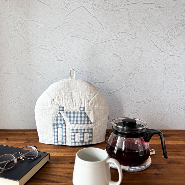 お茶やコーヒーを淹れたけど、時間が経って冷めてしまったことはありませんか? 淹れた後にちょっと手が離れたり、家族の食事の時間が合わないのはよくあること。 そんなときに便利なティーコゼを作りました。 急須やティーポットにカポっと被せるだけで気軽に保温できるので、温め直す回数もグンと減らせます。 パッチワークのおうちは見た目にもほっこり。 ほどよいアクセントになりつつ、少しグレーがかったスモーキーカラーでスッとお部屋に馴染みます。 3色の中でくすみライトブルーは爽やかで大人っぽい印象です。 ギンガムチェックがとっても可愛いので、敢えてホワイトだけを合わせてスッキリと仕上げました。 手仕事の雰囲気を楽しんでいただけるよう、おうちの周りを手縫いで細かくキルティングしています。 裏布はチェックに合うグレーのキルティング生地を選びました。 汚れが目立たないのもポイントです。 カーブにはダーツを4か所入れて、型崩れしにくくしました。 お揃いのポットマットと使うのも、統一感が出ておすすめです。 マットを使わないときはティーコゼ本体にぶら下げて収納できます。 セットで母の日や新築祝いなどのプレゼントにもぴったりです。 ハンドメイドのぬくもりも一緒に、温かい飲み物をゆったりと味わってもらえたらうれしいです。 〇保温目安について 室温や残量等の条件で変化しますが、1時間ほどは温かさをキープできます。 ※お湯を沸かしてからの温度を測ってみました ・ティーコゼあり 0分:84℃▷30分後:66℃▷60分後:57℃▷90分後:49℃(少し冷めたかな?と感じる程度) ・ティーコゼなし 0℃:85℃▷30分後:63℃▷60分後:48℃▷90分後:40℃(ぬるいと感じました) 〇サイズ ・ティーコゼ たて:22㎝ よこ:26.5㎝ 厚さ:3.7㎝ フック:4㎝ (平置き時、手作りのため多少の個体差があります) ※2~4杯用のサイズ感です ・ポットマット 直径:15㎝ フック:4㎝ 〇素材 ・表布:コットン ・キルト芯:ポリエステル ・裏布:キルティング生地 〇お手入れ方法 型崩れ防止のため、中性洗剤でやさしく手洗いまたはネットに入れて洗濯機で洗ってください。 アイロンは中温でかけてください。 〇ラッピングについて 有料(+300円)でボックスに入れてラッピングいたします。 ご希望のリボンをオプションよりお選びください。 〇ご購入時の注意点 ・布製ですので、火気近くではご注意下さい。 ・丁寧な縫製を心がけていますが 縫い目のゆがみやズレなどはハンドメイドの味わいとお考えくださると幸いです。 ・光の加減等で画像上の色と実際の色が異なる場合があります。 ご了承いただいた上でご購入をお願いします。 ・総柄の生地を使用しておりますので、1枚1枚柄の出方が異なります。