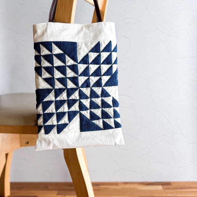 ぷくっと浮き出た模様や 手縫いのやわらかな質感が魅力のパッチワークキルト。 そんな手仕事のあたたかみをぎゅっと詰め込んだトートバッグができました。 ‐‐‐‐‐‐‐‐‐‐‐‐‐‐‐‐ 〇深いブルーが美しい、ラオスで手織りされた藍染め生地 「海」という名前が付けられた、濃いブルーの生地はラオスで手織りされたもの。 ラオスは暮らしの中に”手しごと”が根付いている国で、 木の皮や綿花など、自然のものを使って染めたり 昔ながらの織り機で一枚ずつ丁寧に織ったり… そんな布作りが、今も日常の中で続けられています。 ホワイトとのシンプルな組み合わせですが、 糸の細い太いや色の濃淡、しっかりした厚みなど 手織りならではの味わいが引き立ち、とても素敵に仕上がりました。 「オーシャンウェーブ」という”海”にピッタリなパッチワークのパターンからは、 まるで白波の音が聞こえてきそうです。 ‐‐‐‐‐‐‐‐‐‐‐‐‐‐‐‐ 〇気負わず使える、ひとさじのアクセント 幾何学模様のようなデザインがアクセントになり、 シンプルなお洋服に合わせるだけでサマになります。 ちょっとしたお散歩やジムなど コーディネートをしっかり考えるほどでもないな… というときにもぴったりです。 内ポケットやマグネットボタンなどは敢えてつけずに 必要なものだけを入れてサラッと使えるイメージでお作りしました。 持ち手はやわらかな合皮を使い、上品さをプラスしています。 ‐‐‐‐‐‐‐‐‐‐‐‐‐‐‐‐ 〇一点もの 中布には、表に似合う濃紺が綺麗な生地を使いました。 色も質感も気に入っていましたが、残念ながら廃番になってしましました。 今後手に入りにくいラオスや廃番の生地を使っていることから、 一点もの作品とさせていただきます。 世界でたった一つの特別感を味わってもらえたら嬉しいです。 ◇◇パッチワークキルトとは◇◇◇ 小さな布片を一つ一つ縫い繋いだパッチワークと裏布の間に綿を挟んで ステッチ(=キルティング)をしたものです。 何時間、何日、時には何ヶ月もかけて作られるもので、 手間と思いが詰まったキルトは、大切に代々受け継がれることもあります。 ◇◇◇◇◇◇◇◇◇◇◇◇◇◇◇◇ 〇サイズ、仕様 たて:32cm よこ:23cm マチなし 裏表で色を反転させています。 〇素材 コットン(上下は帆布を使用) 合皮(持ち手部分) ○お手入れ方法 汚れがついたときは、中性洗剤を溶かした水を柔らかい布に含ませ トントン叩いて汚れを取り、その後水を含ませた布で洗剤をやさしく拭き取って下さい。 持ち手や藍染は濡れると色落ちする場合がありますので、ご注意ください。 〇ご購入時の注意点 ・丁寧な縫製を心がけていますが、縫い目のゆがみやズレなどは ハンドメイドの味わいとお考えいただけると幸いです。 ・光の加減等で画像上の色と実際の色が異なる場合があります。