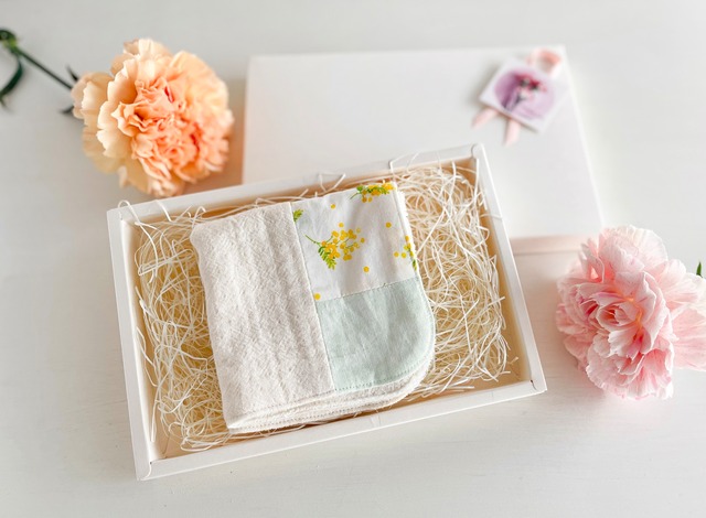 やさしい拭き心地で使いやすいタオルハンカチ。 パッチワークのアクセントとふわふわの手触りに癒されます。 ぽこぽことした生成りのガーゼとコロコロ可愛いミモザのパッチワークを合わせ、ナチュラルでやわらかな雰囲気に仕上がりました。 厚みのあるダブルガーゼとやわらかなパイルで吸水性があり、サッとやさしく拭くことが出来ます。 春のご挨拶や母の日など、ちょっとしたプレゼントにも喜ばれそうです。 お揃いのスタイやおもちゃをセットにしたプレゼントもおすすめ。 お気に入りのハンカチで、軽やかにお出かけしてくださいね。 ‐‐‐‐‐‐‐‐‐‐‐‐‐‐‐‐‐‐‐‐‐‐ 〇お揃いのアイテムはこちら ・長く遊べる♪にぎにぎクマさん*ミモザ https://chouchin.thebase.in/items/83050958 ・ガーゼとパイルのふわふわスタイ*ミモザ https://chouchin.thebase.in/items/83051086 ・ミモザの出産祝いギフトbox https://chouchin.thebase.in/items/83051155 ‐‐‐‐‐‐‐‐‐‐‐‐‐‐‐‐‐‐‐‐‐‐ ○サイズ 縦・横23cm ○素材 パイル地:綿80%、ポリエステル20%(ノーホルマリン加工) その他コットン、リネン ○お手入れ方法 手洗いまたはネットに入れて洗濯機で洗って下さい。 干すときは形を整え、しわを伸ばして下さい。 アイロンはパイルがつぶれないよう、ガーゼの方からのみかけてください。 ○ラッピング +150円~BOXをご用意しております。 オプションよりリボンのカラーをお選びください。 プレゼント先様に直接発送される場合は、宛名にプレゼント先様のお名前、ご住所、電話番号をご記入いただき、備考欄にご注文者様のお名前、ご住所、電話番号をご記入ください。 ご記入いただけない場合は発送元が「あかりや」となりますのでご注意ください。 ○購入時の注意点 ・他サイトでも販売していますので、突如在庫がなくなる可能性もございます。 ・丁寧な縫製を心がけていますが、縫い目のゆがみやズレなどはハンドメイドの味わいとお考えくださると幸いです。 ・光の加減等で画像上の色と実際の色が異なる場合があります。ご了承いただいた上でご購入をお願いします。 ・総柄の生地を使用しておりますので、1枚1枚柄の出方が異なります。 ○お揃いの柄のシリーズもあります ・ふんわりキルトのジャバラケース【受注制作/A6/B6/A5対応】ミモザのおうち https://chouchin.thebase.in/items/83050905 ・ガーゼとパイルのふわふわスタイ*ミモザ https://chouchin.thebase.in/items/83051086 ・長く遊べる♪にぎにぎクマさん*ミモザ https://chouchin.thebase.in/items/83050958 ・ミモザの出産祝いギフトbox https://chouchin.thebase.in/items/83051155