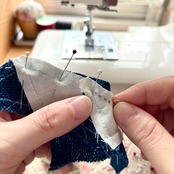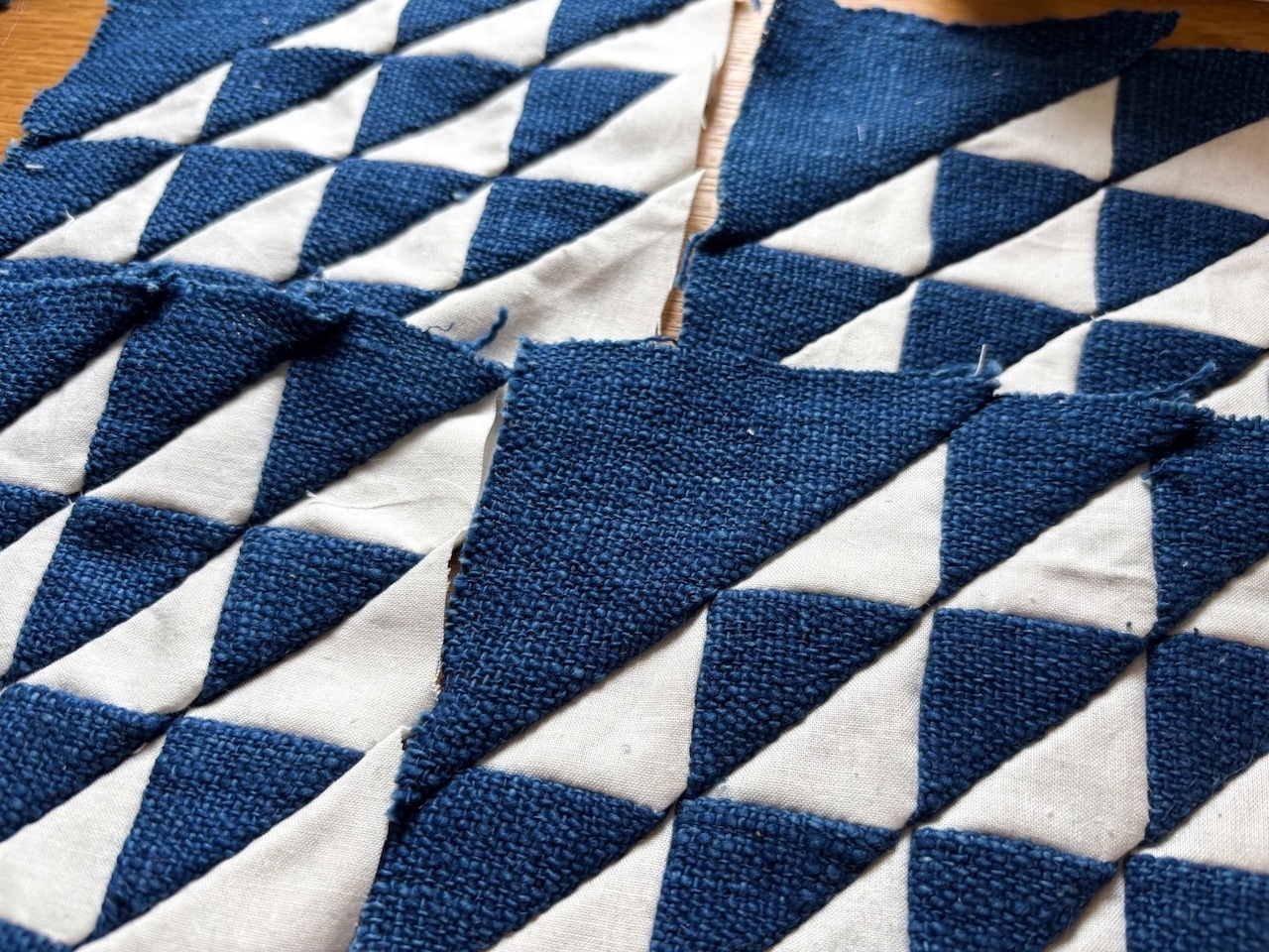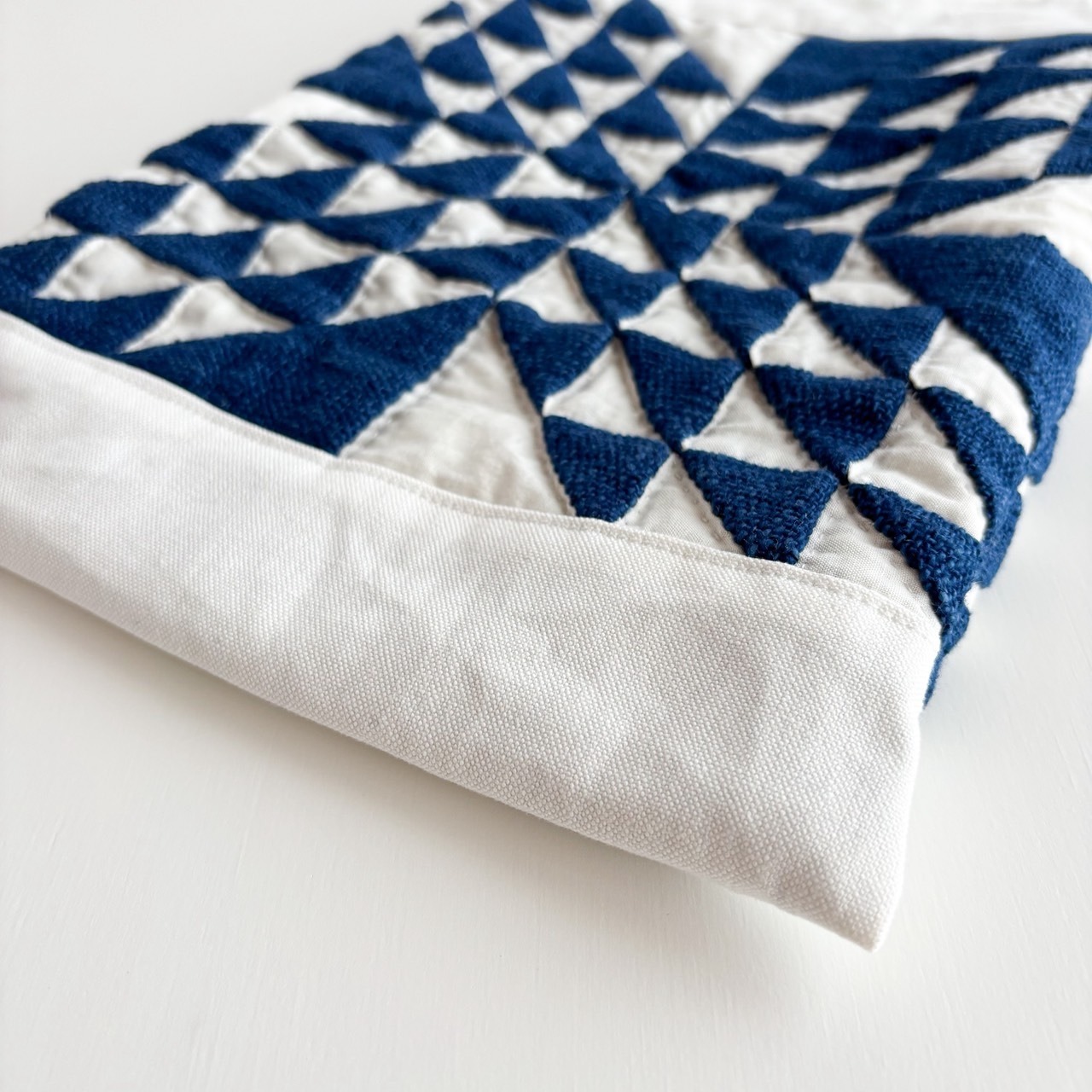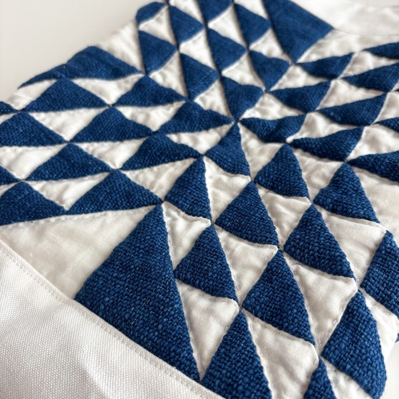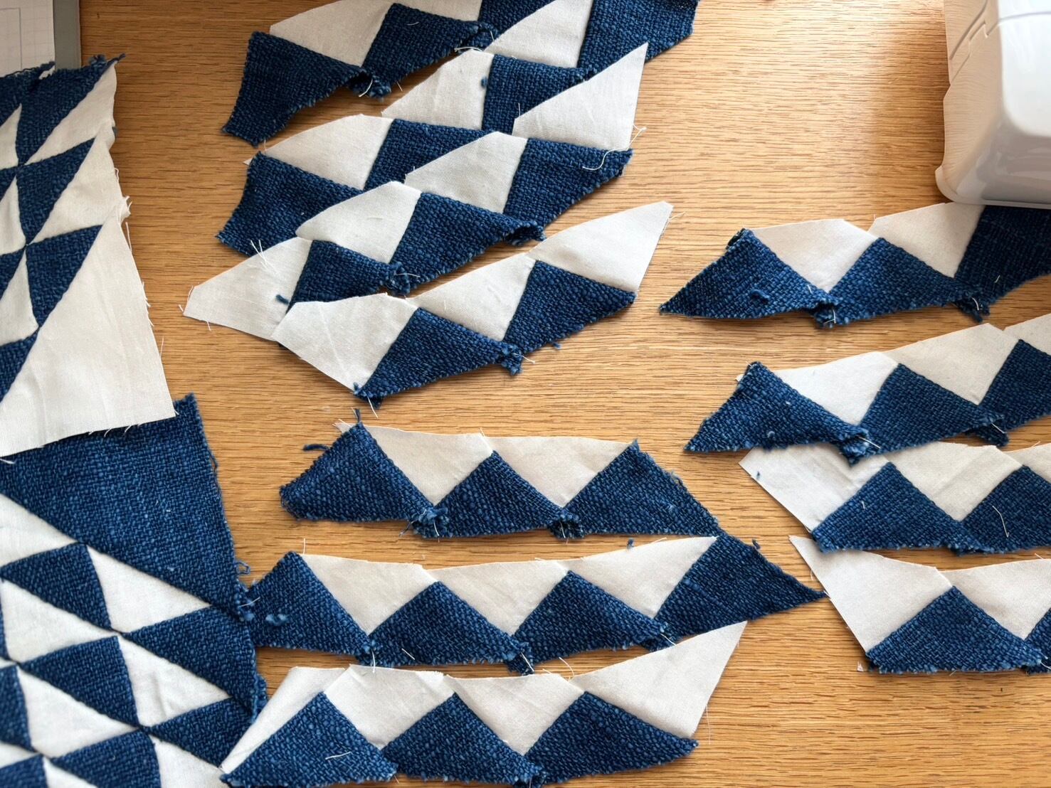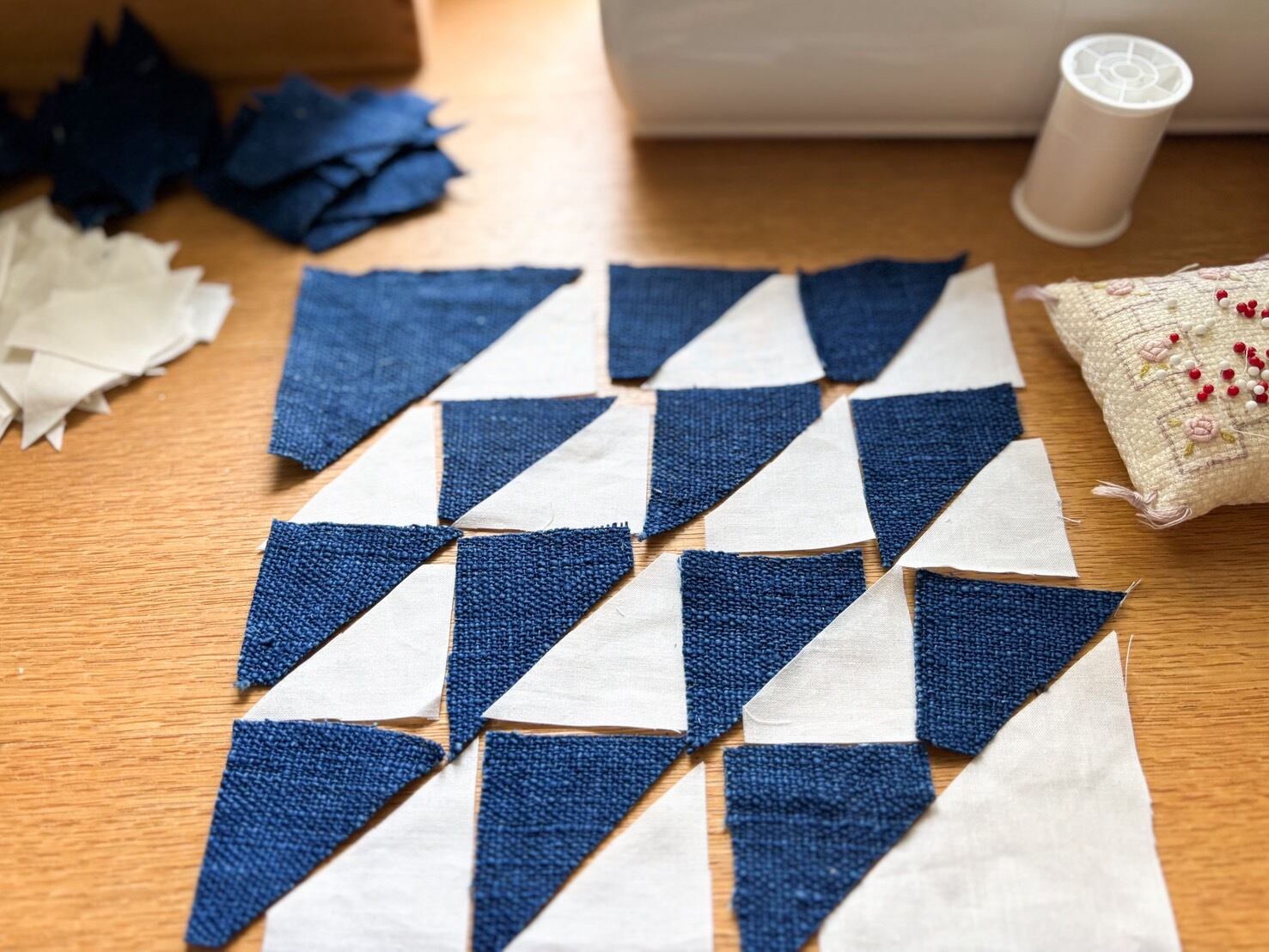 そんな”海”にぴったりな「オーシャンウェーブ」というパターンを選び、小さな三角にカットしてホワイトの生地と手縫いで丁寧に縫い合わせました。